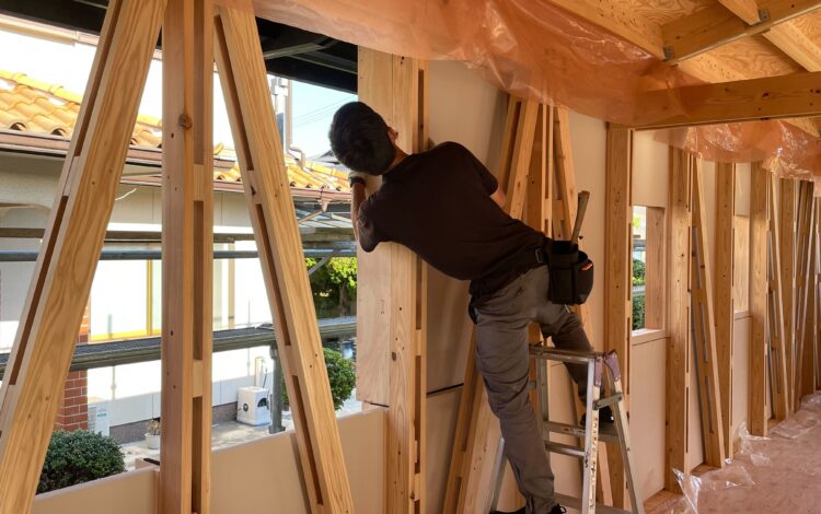 また壁面では、お施主さまと一緒に工場で製作した壁パネルの取り付けも進んでいました!
