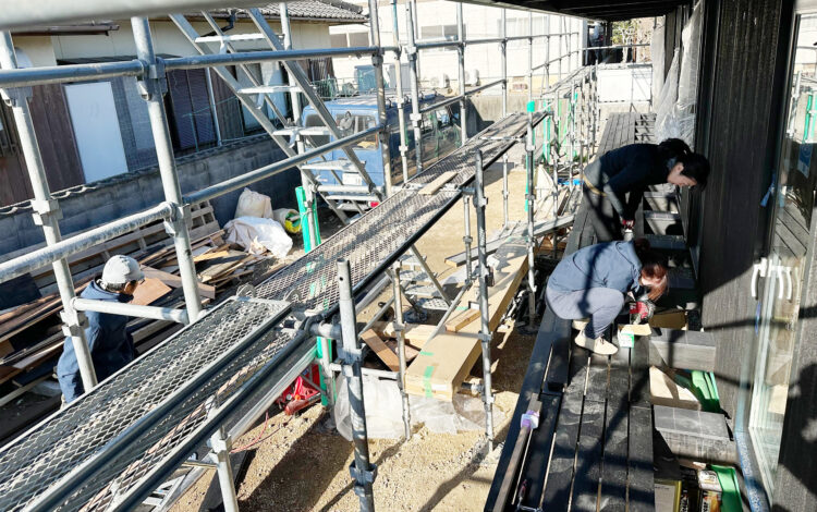 この日は外壁工事。 外壁には焼杉という材料を使用しました。