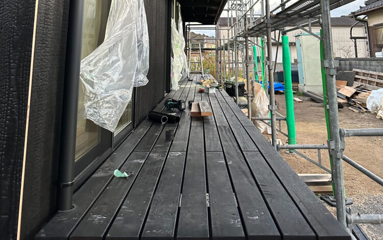 外壁の色に合わせて、ウッドデッキの材料も黒に塗装。デッキはお施主さまみずから、ご友人と一緒に施工をしていただきました。