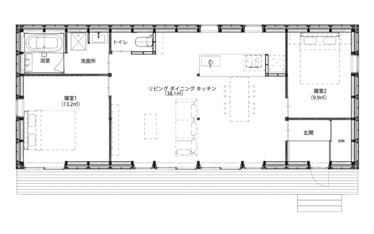 - 建方、断熱、気密、床、壁、天井、キッチン組み立て、ウッドデッキ
