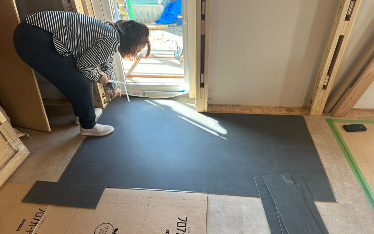 床は、フロアタイルと呼ばれる材料で、傷や汚れに強いことと、カッターなどで加工できるため、DIYでの施工性も優れています。